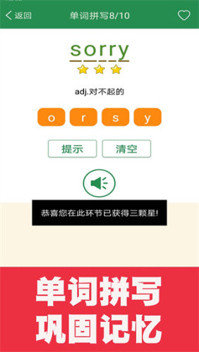 5、单词记忆游戏化,游戏界面精美,趣味十足,记忆效果翻倍;