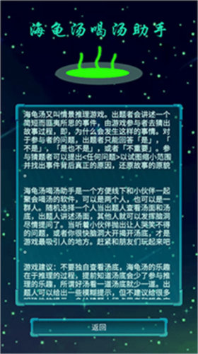 《海龟汤喝汤助手》是一款非常深受大众们喜爱的休闲益智游戏,这款游戏为玩家们带来了非常多的乐趣,玩家们可以在这里绞尽脑汁来解开系统每日派发的谜题,也能探索大量有趣的题材和内容,游戏也提供了非常多精彩有趣的谜题和关卡让玩家们挑战噢。