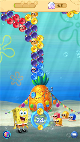 《海绵宝宝泡泡爆破》是一款轻松有趣的休闲游戏,玩家将和海绵宝宝一起踏上冒险旅程,体验泡泡消除的乐趣,游戏的玩法和经典的泡泡龙一样,玩家需要发射相同颜色的泡泡,让它们相连并消除掉,逐步清除所有泡泡,完成关卡挑战。