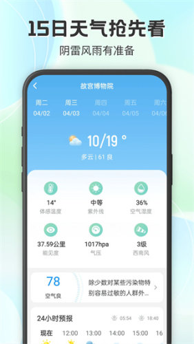 2、提供非常精准的天气预报服务,用户可以快速以及轻松了解到未来几天的天气变化;