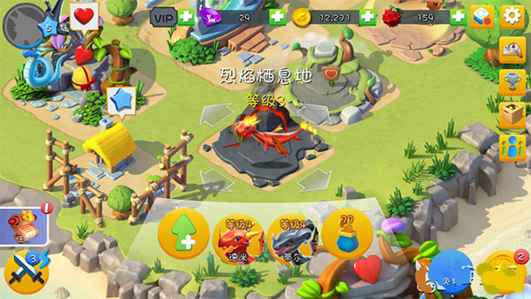 5、点击想要移动的建筑物并会出现方向标进行长按后就可以自由移动,在移动的时候会有树木,石头等等物品阻碍我们放置建筑物而只需要花费金币就可以进行铲除,多升级建筑物来容纳更多的萌龙和生产出更多的食物和生更多的蛋。