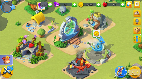 3、右侧拥有四种图标,第一个图标是你的收藏和龙族得宝典,可以查看你所收藏的萌龙和获取龙的途径。第二个图标是勋章,就是需要完成任务后可以点击这里看你已完成的任务并且领取。第三个图标是仓库,就是可以把空闲的农场,繁育洞和龙等等放在这里面存储。而第四个图标是社交功能,可以添加好友一起建立部落以及收到的礼物和信息都会在这里;