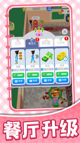 2、进入角色面板,可以对角色、清洁工、顾客与垃圾桶进行升级,提升他们的速度、收益与清洁效率,让整个餐厅运作更流畅;