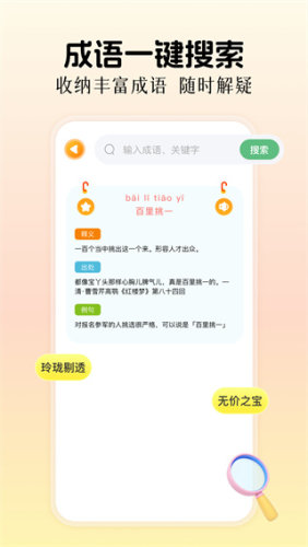 3、提供详细的成语释义,帮助用户在语文写作上更好的发挥,获得更高的分数;