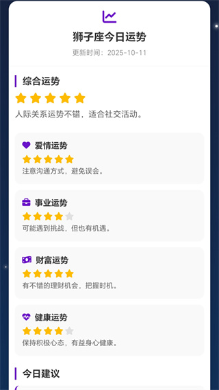 1、特别设有开运指南,根据当日运势推荐幸运物、吉利方向,让用户可以把抓星座带来的好时机;