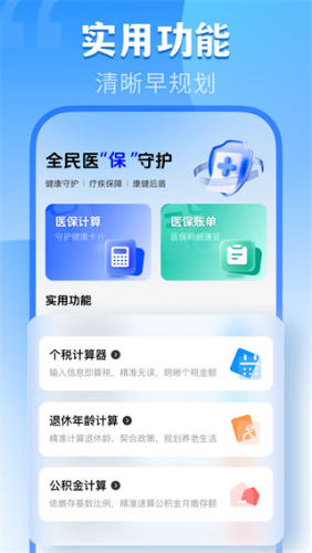 3、进入主界面就可以体验医保账户实时查询、个税或是公积金智能测算、退休年龄预估等功能;