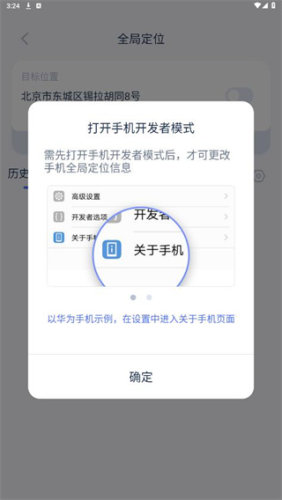 2、进入手机设置,找到关于手机的按键,立即点击,找出版本信息7次就能解锁开发者选项,找到选择位置信息应用的选项,选择孙行者就能完成。