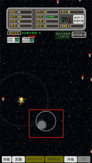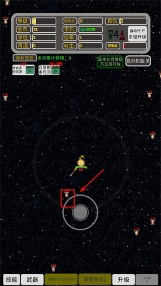 3、锁定红框里的敌人,点击攻击按钮进行射击,累积击败数量,获得金币和宝石奖励。