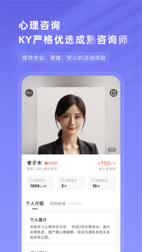 KY全球优选华人心理咨询师入驻,提供预约制专业心理咨询,视频通话功能令你和你的咨询师畅通交流。