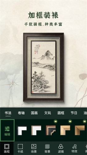 传图加画框是一款为书法,国画,油画,美术,摄影作品在线加框装裱工具,通过APP可以将你的艺术作品在线装裱上美美的画框,让习作变作品,尽显您对艺术的热爱。
