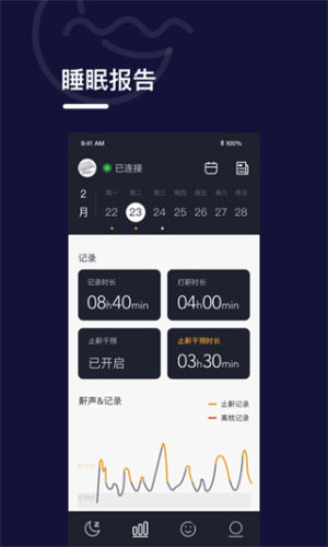 2、准确的追踪并记录用户的入睡、苏醒时刻以及深度或轻度睡眠时段分配;