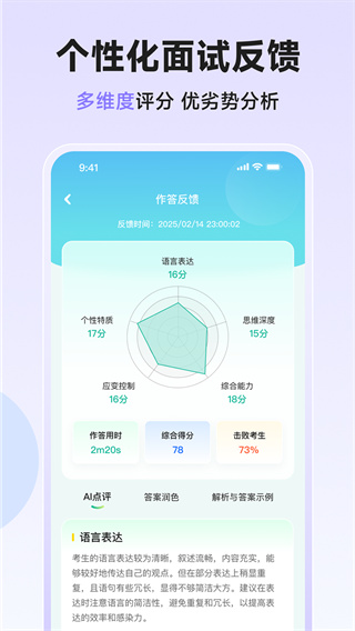 ◆ 专属反馈报告:五维能力雷达图,全方位评估语言表达、逻辑思维、综合能力、应变控制、个性特质,精准定位成长空间。