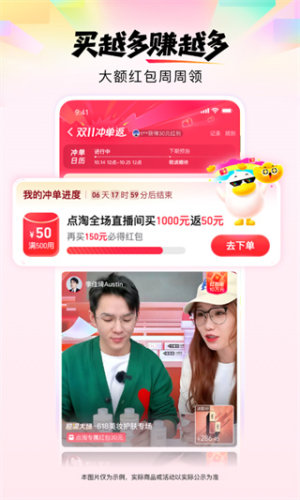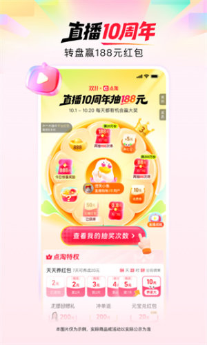 2、【直播开启新世界,淘好物逛不停】 亿万网民的选货达人汇集于此,为你甄选更优质的商品,为你提供更优惠的价格,还有明星空降直播间,万千主播总有你的pick。开蚌、开翡翠原石、撸猫遛狗,打开奇奇怪怪可可爱爱的新世界大门,新奇有趣近在眼前。