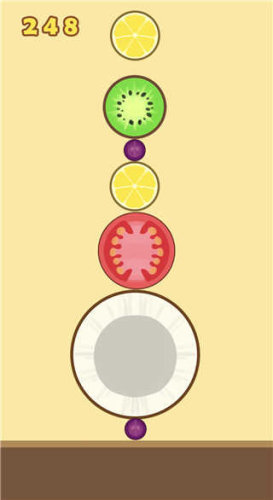 3、每当水果往下降落的时候,可以操控水果的方向,一旦堆满了水果抵达到了一定的高度限制将直接结束游戏。