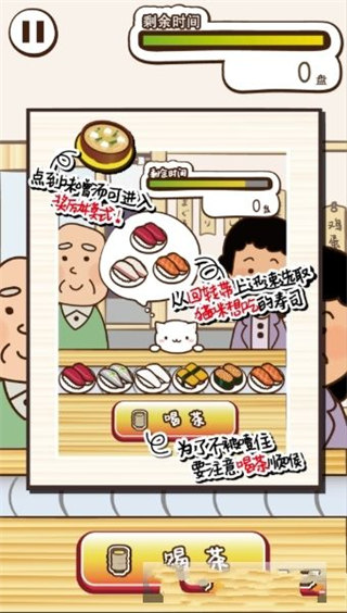 3、根据猫咪头上所冒出的气泡,选择对应的寿司,给与猫咪吃掉,一旦出太多还会眼珠,当出现痛苦表情是需要提供一杯茶水。