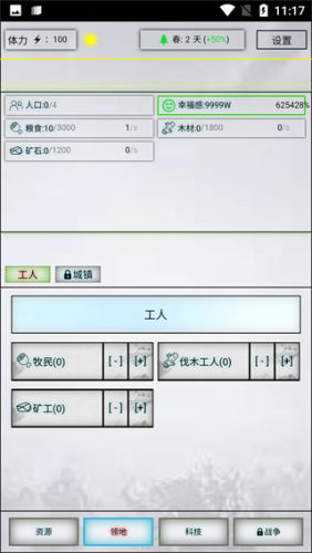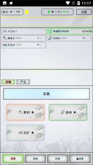 3、资源采集过程中,不断扩大自己的果园种植范围和矿山开采区域,增加食物、矿石等基础资源的收入获取量。