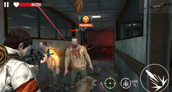 1、进入游戏后玩家只需要点击左侧的屏幕区域进行瞄准,找准僵尸的位置后再点击射击按钮即可开火。不断精准击中目标就能快速清理一波又一波来袭的僵尸。
