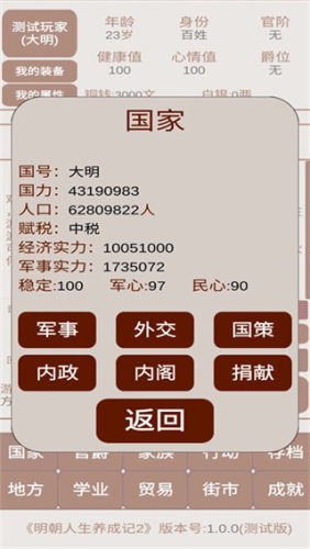 《明朝人生养成记2》是一款以大明时代为背景的单机文字养成游戏,自由选择当官经商自立为王甚至称帝,一切人生走向都由玩家来决定,作为前作的全面升级版游戏重做了官职系统,加入了真实的明朝派系斗争,还新增了子嗣成婚生子自立扩张等玩法,让整个大明世界变得更完整更耐玩,不论是想体验朝堂沉浮还是想当富甲一方的大商人,或是一步步统一天下,这款游戏都能让玩家感受到一段真正属于自己的明朝人生。