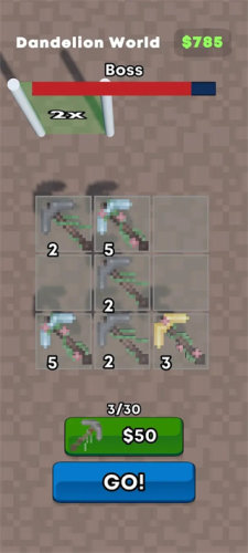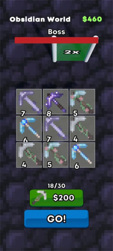 玩家将从基础铁镐开始挑战,随着不断突破关卡能收集到更多不同等级的武器。只要将两把相同的镐子拖拽合并就能一次次提升武器强度让挖掘和战斗更有效率,在关卡前进时需要面对各种方块障碍有些需要高强度镐子才能粉碎所以提升武器等级相当重要。敌人会在矿道中出现而矿工能使用镐子施展不同攻击技能击败对手获得额外奖励和金币,金币能用于扩大武器收藏、提升装备或解锁新的皮肤和外观让角色更具个性。除了挖矿战斗途中还会加入轻度谜题,玩家需动脑才能打开道路增加冒险趣味。