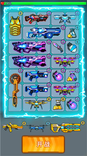 1、点击开始游戏就会直接进入到关卡内,把所有的武器都填满格子中遇到一样的武器可以拿来合成升级,完成之后点击右下角开战;