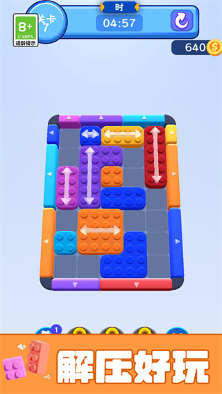 1、开始游戏后,你将从第一关出发,滑动方块让它们排成一排,解锁通往下一关的门。