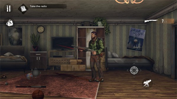 2、遭遇僵尸时,点击射击按钮进行反击,靠近互动物品,能够进行搜索,自由选择携带部分或全部物资;