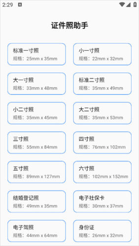 1、自由的选择合适的尺寸类型,如有一寸,二寸等各种正规且标准的证件照模版;