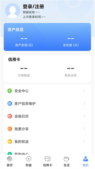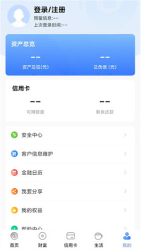 5、我的:汇总查询客户在手机银行上的资产及信用卡信息、自定义的各项安全设置、7*24小时的在线客服等。