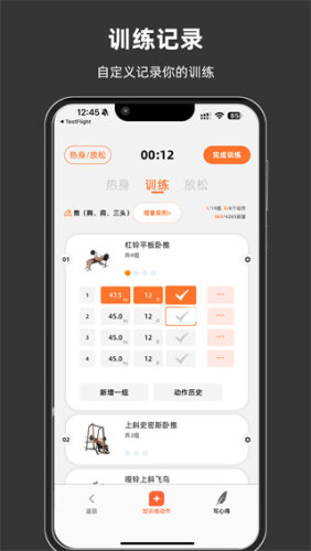 * 训练过程更自由:训练中可增减动作/组数/热身,自由调重量与次数;自动记录时间、容量与进阶结果;日历与统计从多维度追踪成长。