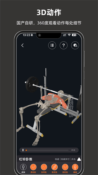 * 动作与解剖更直观:近 500个动作条目+50+真人讲解视频,真实3D解剖展示发力肌群、稳定肌与常见错误/修正;动作历史与笔记一键回看。