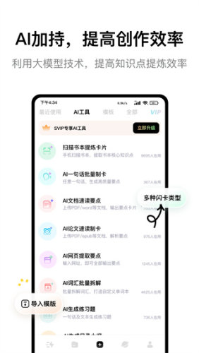 1、提供了多元资料导入,包括PDF、PPT、视频、音频、拍照等方式,快速生成学习的内容;