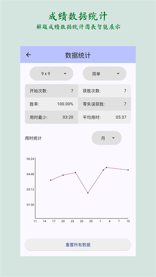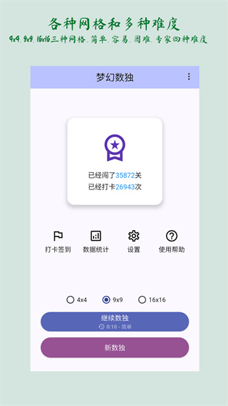 提供了4x4、9x9、16x16网格三种类型的网格选择,还有简单、容易、困难、专家四种难度的模式可以供选择。可以选择适合自己的类型和难度闯关。另外还提供了数独签到打卡功能、解题的数据统计、解题时的提示帮助。数独闯关打卡,快来试试吧。