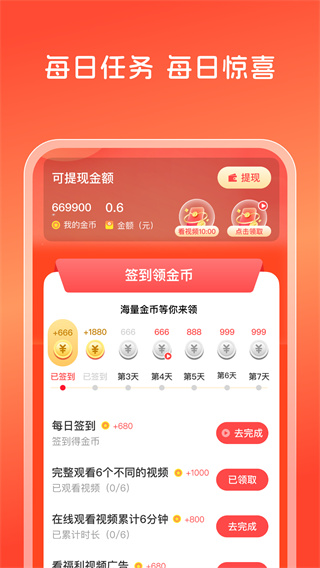 1、每日都有非常多种不同的任务让用户选择并完成,完成任务即可获得金币;
