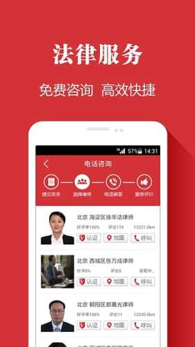 3、是个法律万事通。依托上万名注册的专业律师和众多注册的法官,为用户提供即时的法律咨询服务,无论你是文字咨询还是电话咨询,都能很快得到专业回复。忘了法条,有法律法规大全提供查询;想写文书,有包罗万象的文书模版可供参考;