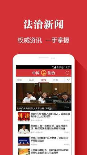 无论是法律界业内人士,还是普通民众,遇到法律问题,打开中国法治,都有您需要的法律事务解决方案。提供法治新闻信息、法规案例查询、律师查找、法律咨询等信息功能,提供公告办理、网上立案、司法拍卖等实用功能。