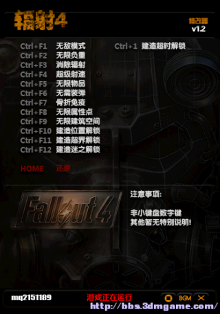 Ctrl+F1 : 无敌模式 (不受攻击影响 免疫辐射 奔跑体力无限)