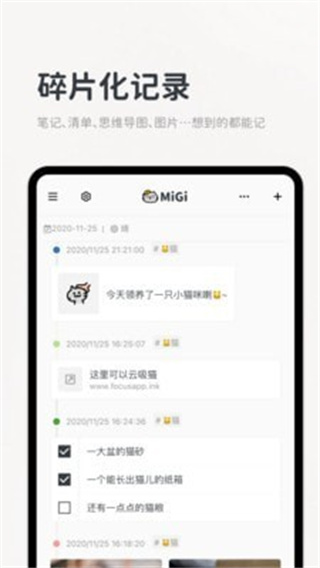 《Migi》是一款笔记管理APP,用户不仅可以高效管理自己的笔记,还可以规划时间和提升专注力,它可以帮助用户更好地组织思绪以及记录灵感,然后在专注的环境中快速完成自己的任务。