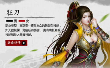 狂刀防厚血长、招重力沉,每招都以接近对手为主,拉人、跳斩、旋风斩等都十分具有震撼力,更有无敌技能buff让玩家能以一当千,特别适合喜欢近战pk的玩家。