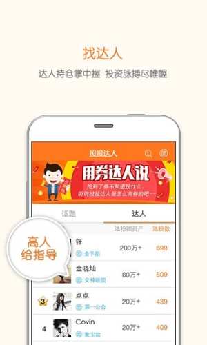 2015社交理财神器,简单理财,投投有道!在这里可以创建您的达粉团,分享您的投资理念,秀出您的理财手法;也可以加入别人的达粉团,理财会友,指点江山!