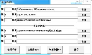 在系统任何情况下都能用快捷桌面定义的热键来打开相对应的文件或程序,快捷桌面可以自定义快捷键连接电脑程序以及文件,也可以用来打开文件夹,方便在我们使用软件时直接打开资源库。可以注册系统热键,即使本程序没有被激活仍能使用热键打开连接的文件。