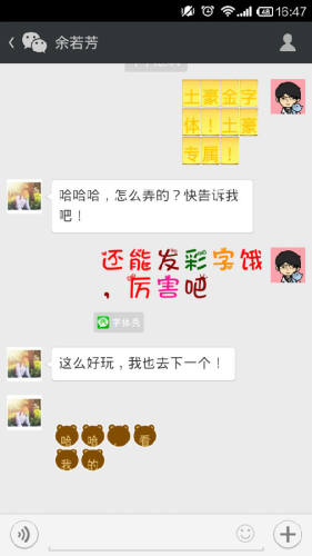 微信字体秀免费为你更换微信中的字体,让微信内的字体像QQ一样炫彩。它含数十种趣味字体,如粽子字体、中国心字体、小熊字体、奶瓶字体、便便字体、猫猫字体、兔兔字体等,趣味生动,让你手机聊天不再单调,每句话都充满乐趣!