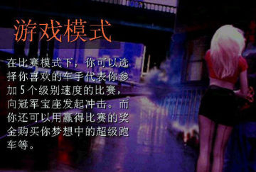 1、比赛进行期间,按小键盘8 + Num Lock + Back Space(退格键)键后可使你的赛车进入自动前进状态,再也不需要长按“前进”键了。(请注意:要取消该秘技,须删除系统的页面文件。)