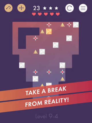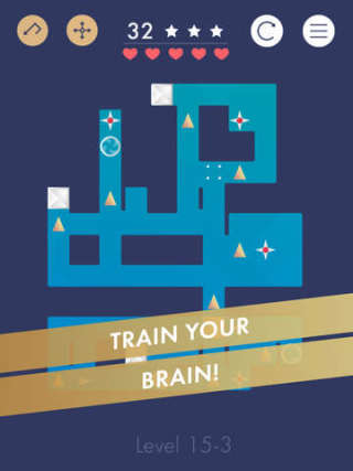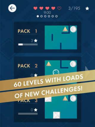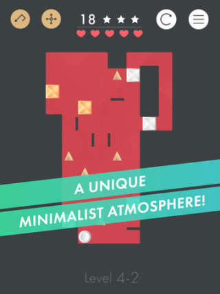 游戏要操控一个小球移动,收集三角形。由于它的直进特性不能中途转弯,所以如何在有限的步数内利用墙壁和传送口、让它成功收集三角形就是考验玩家解谜能力的地方。
