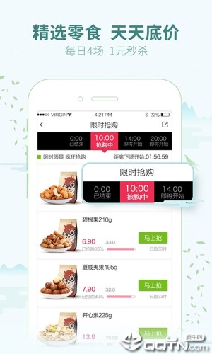 > 限时抢购:每日4场,限时限量的爆款零食,夏威夷果、碧根果等1元开抢
