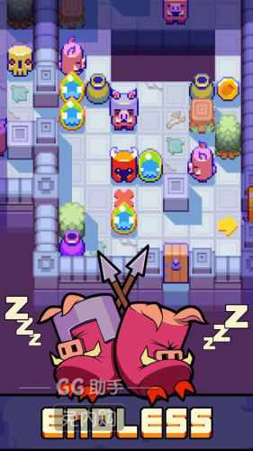 具体操作很简单,玩家通过上下左右划动屏幕控制主角行走,每行动一步,敌方的怪物也会相应的行动。不过敌方的怪物种类相当丰富,有史莱姆、铁甲猪、骷髅头等等,他们的行动方式也各不相同,例如史莱姆每两回合行动一次,铁甲猪调转攻击方向也需要消耗一回合。玩家需要把握敌人的特点,消灭它们,然后走向终点。